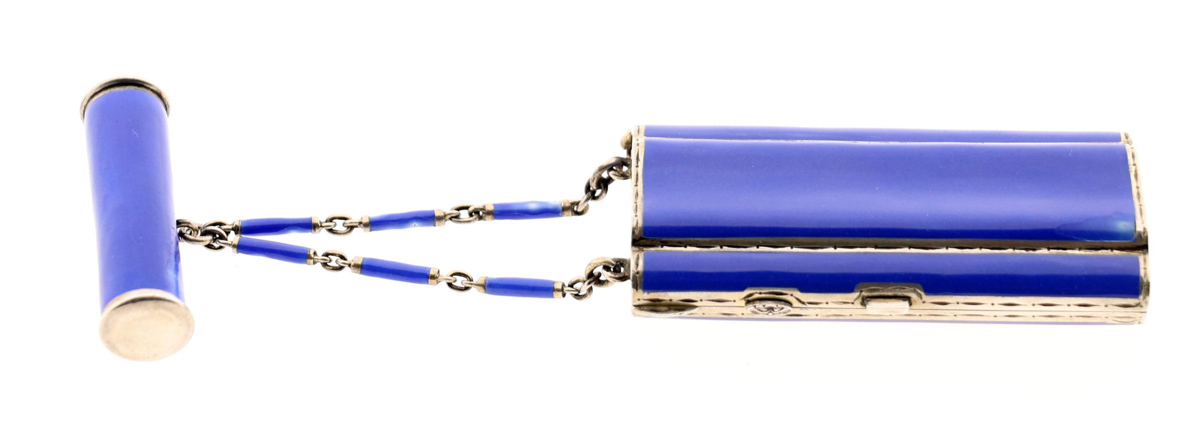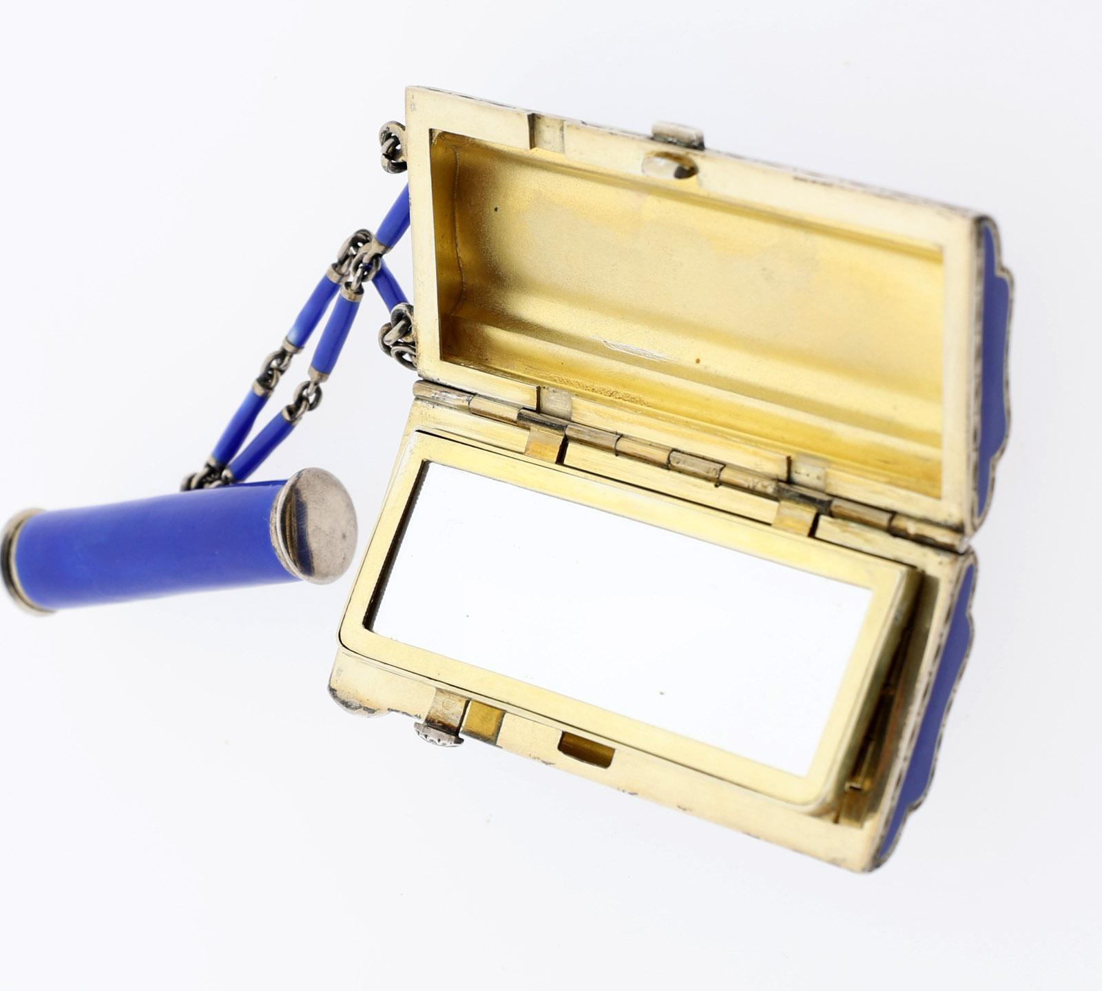 Paars emaille op zilveren compact case/poederdoos met bijbehorende lippenstifthouder, de vergulde binnenzijde van de flacon behelst spiegel, parfumflesjes, naaldenkoker, poedergedeelte, merk Sterling 915 USA, rond 1920, 8,2 x 4,2 x 1,6 cm.