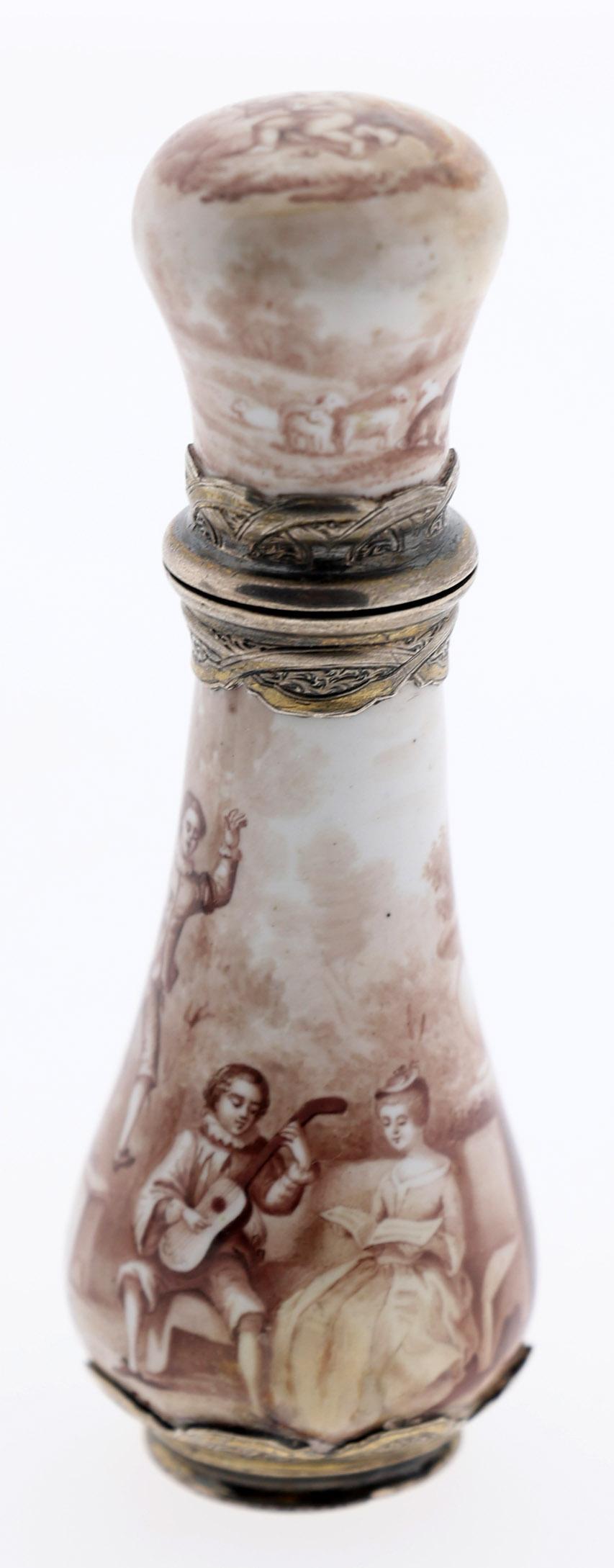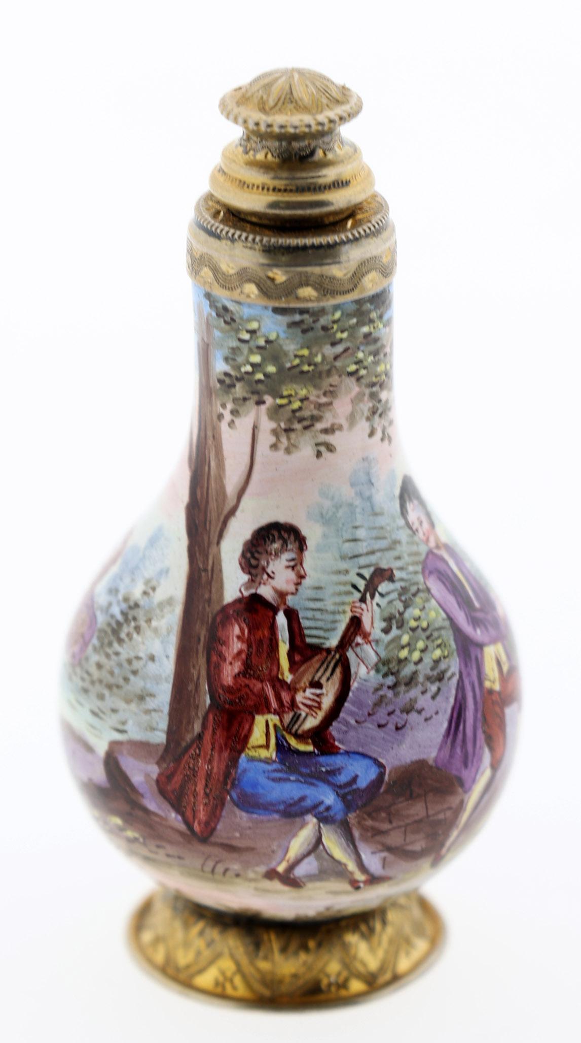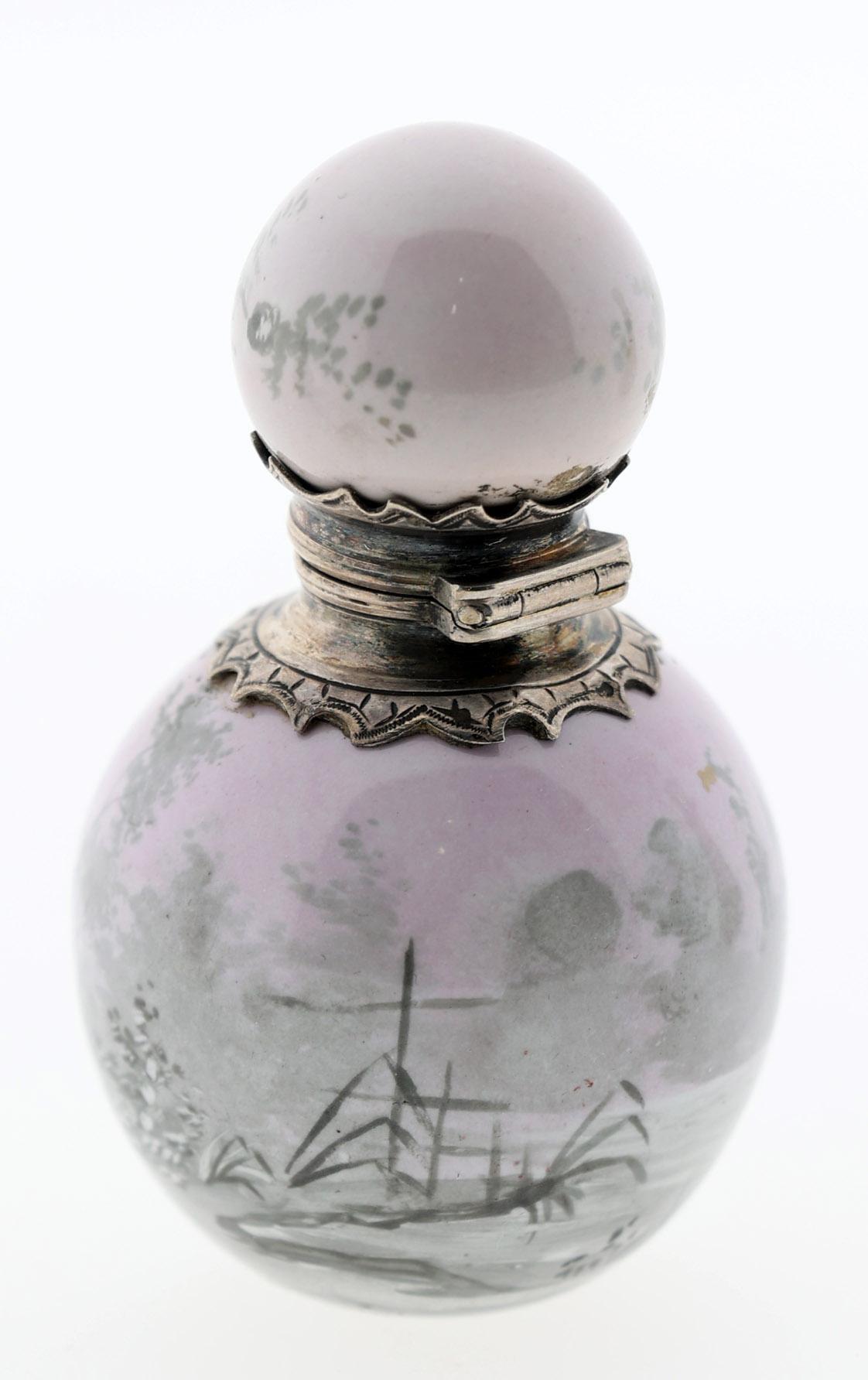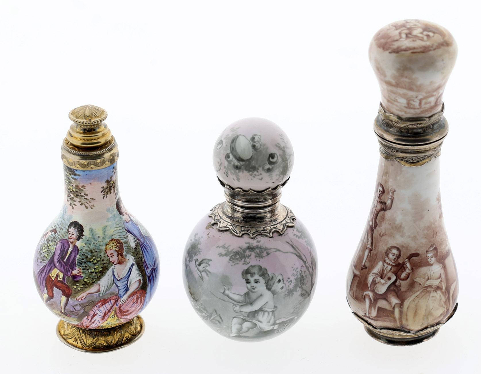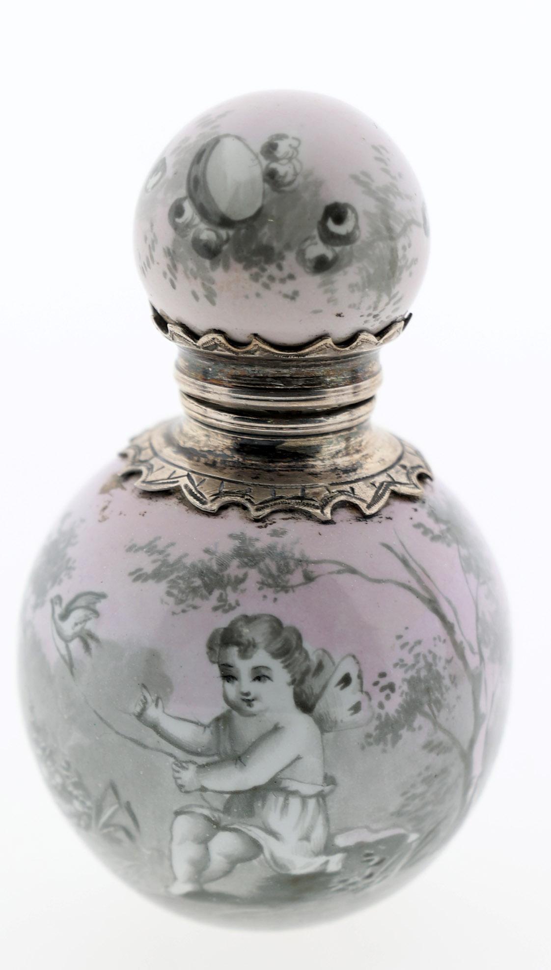 Roze emaille grisaille odeurflacon, Frankrijk, 1860, Weens bolvormig emaille verguld zilveren flacon ca.1860 en een Franse emaille fles odeurflacon ca. 1830