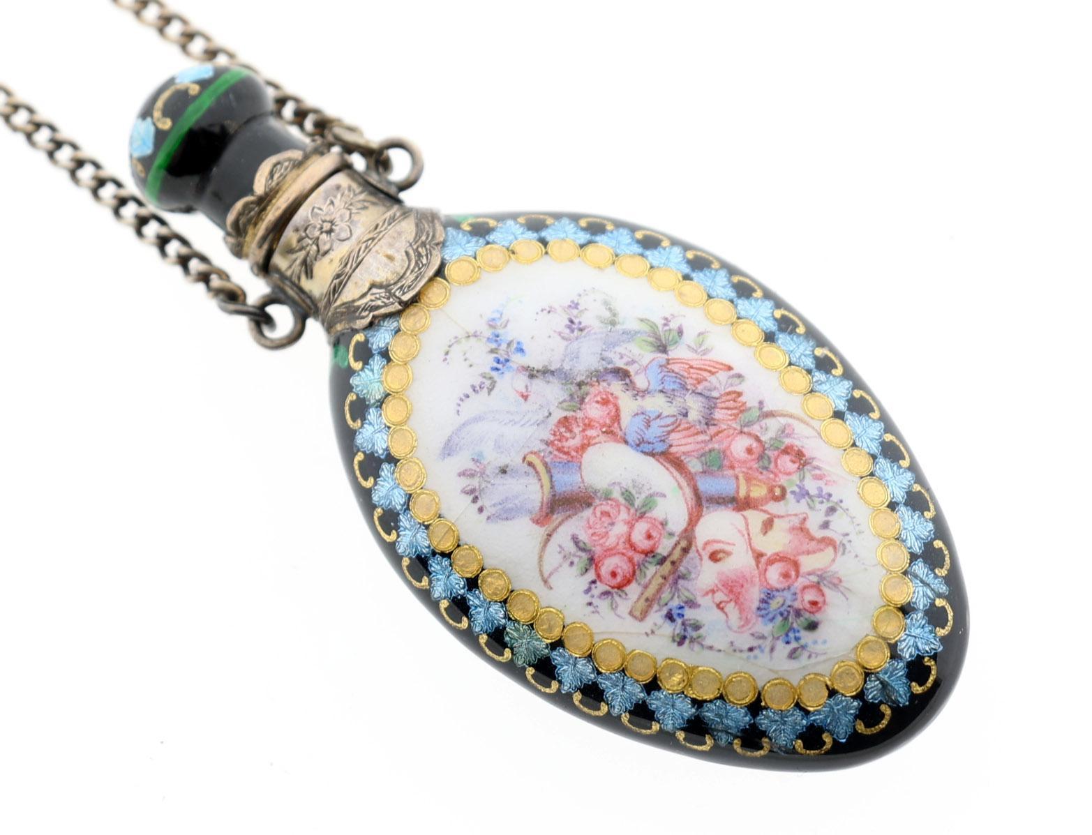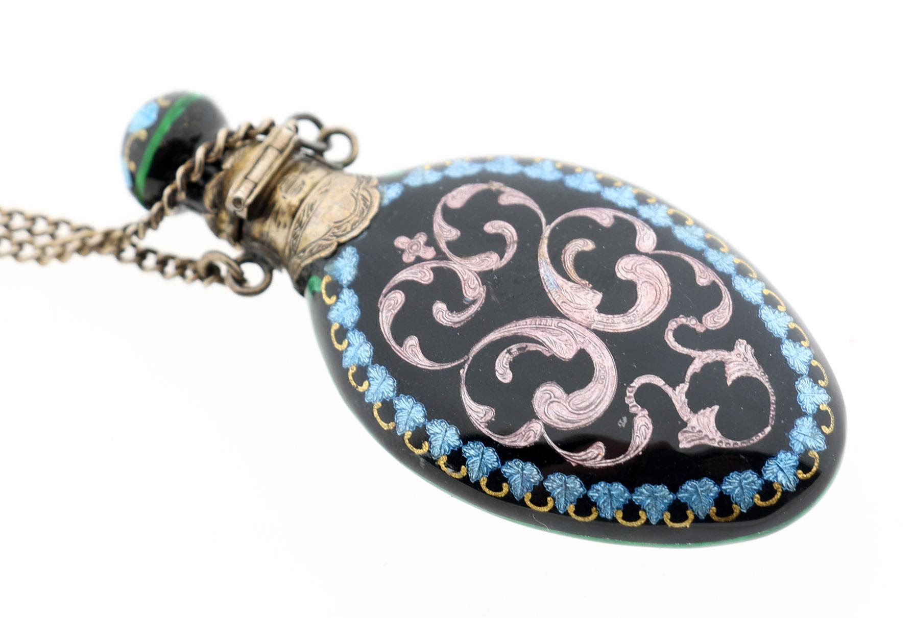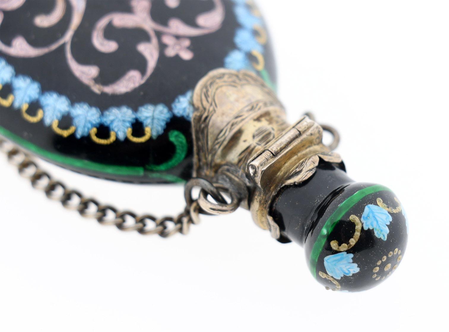 Emaille odeurflacon met zilveren monturen aan ketting, h.7,5 cm., 19e eeuw