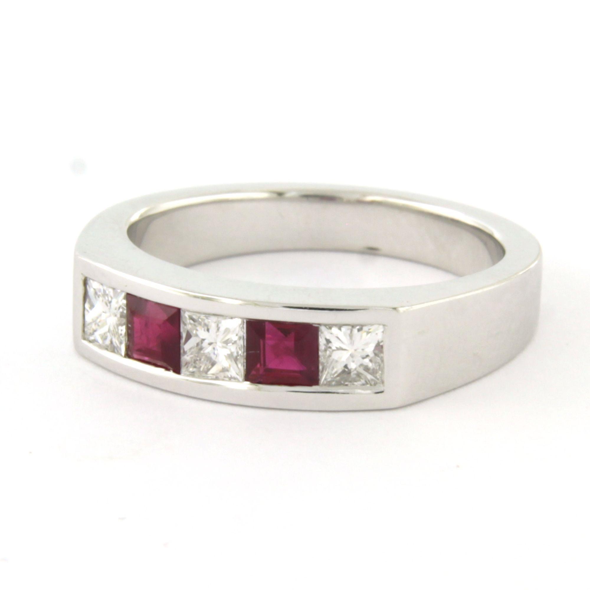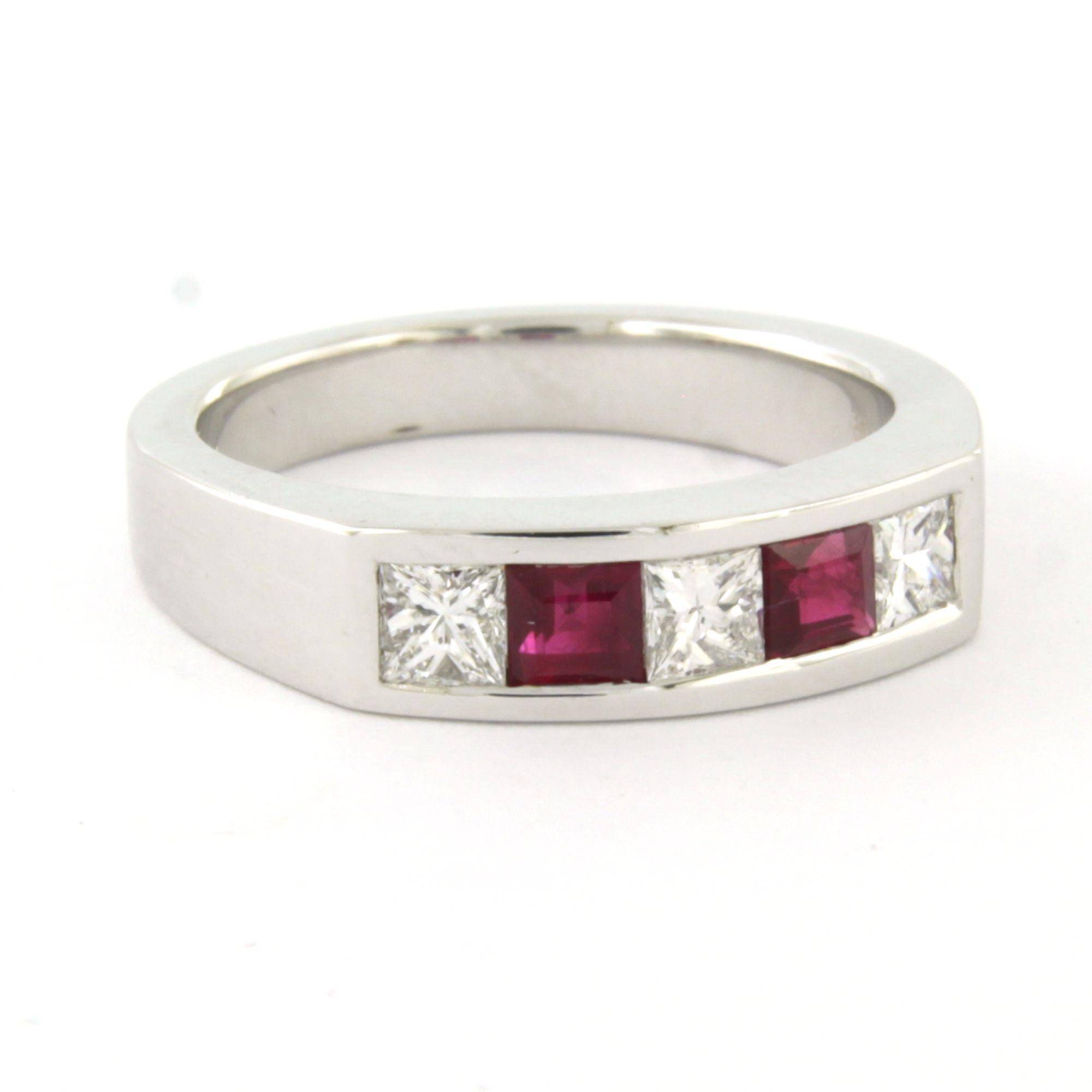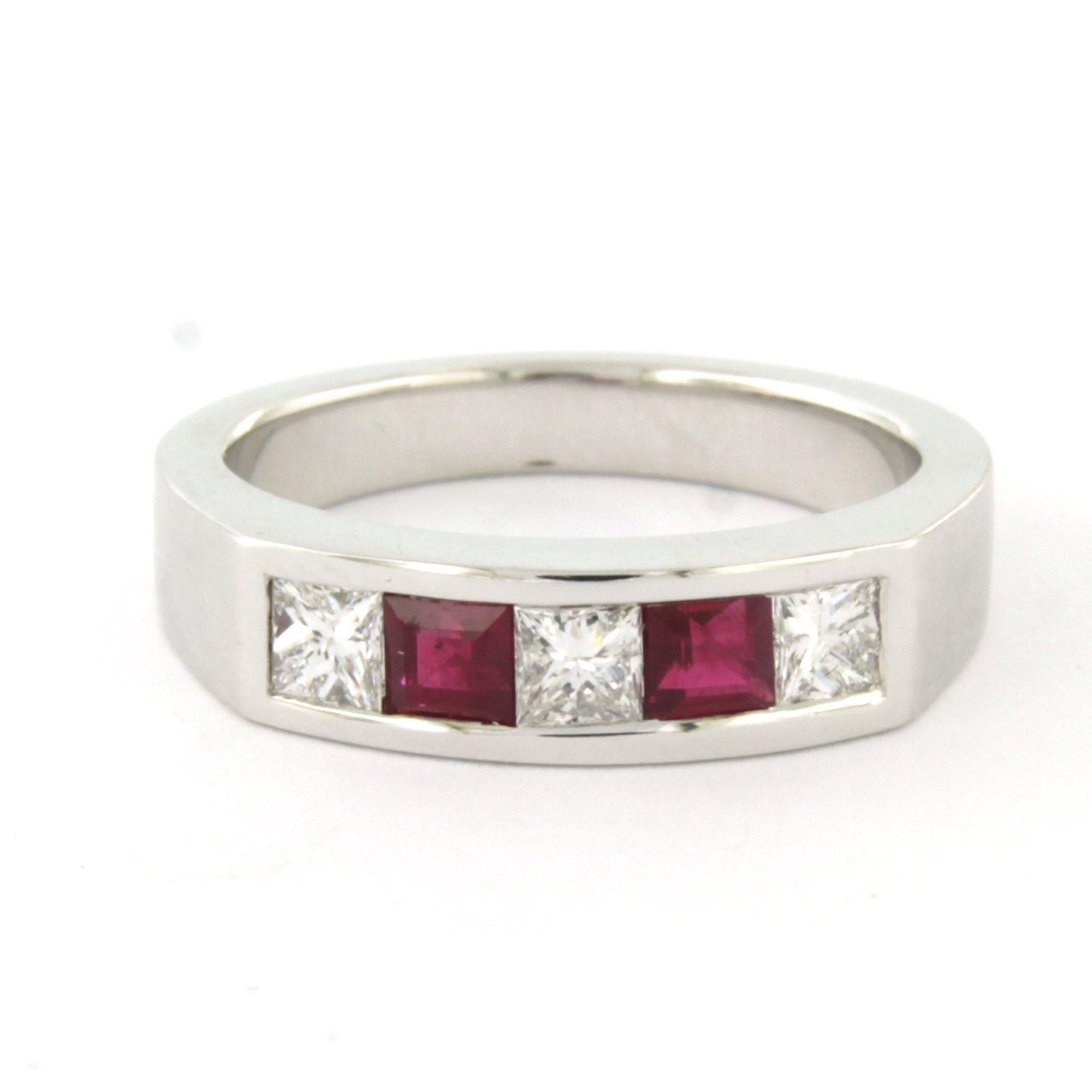 18 Kt. witgouden ring bezet met robijn en princes geslepen diamant tot. 0.50 ct. - ringmaat 17.25(54)
