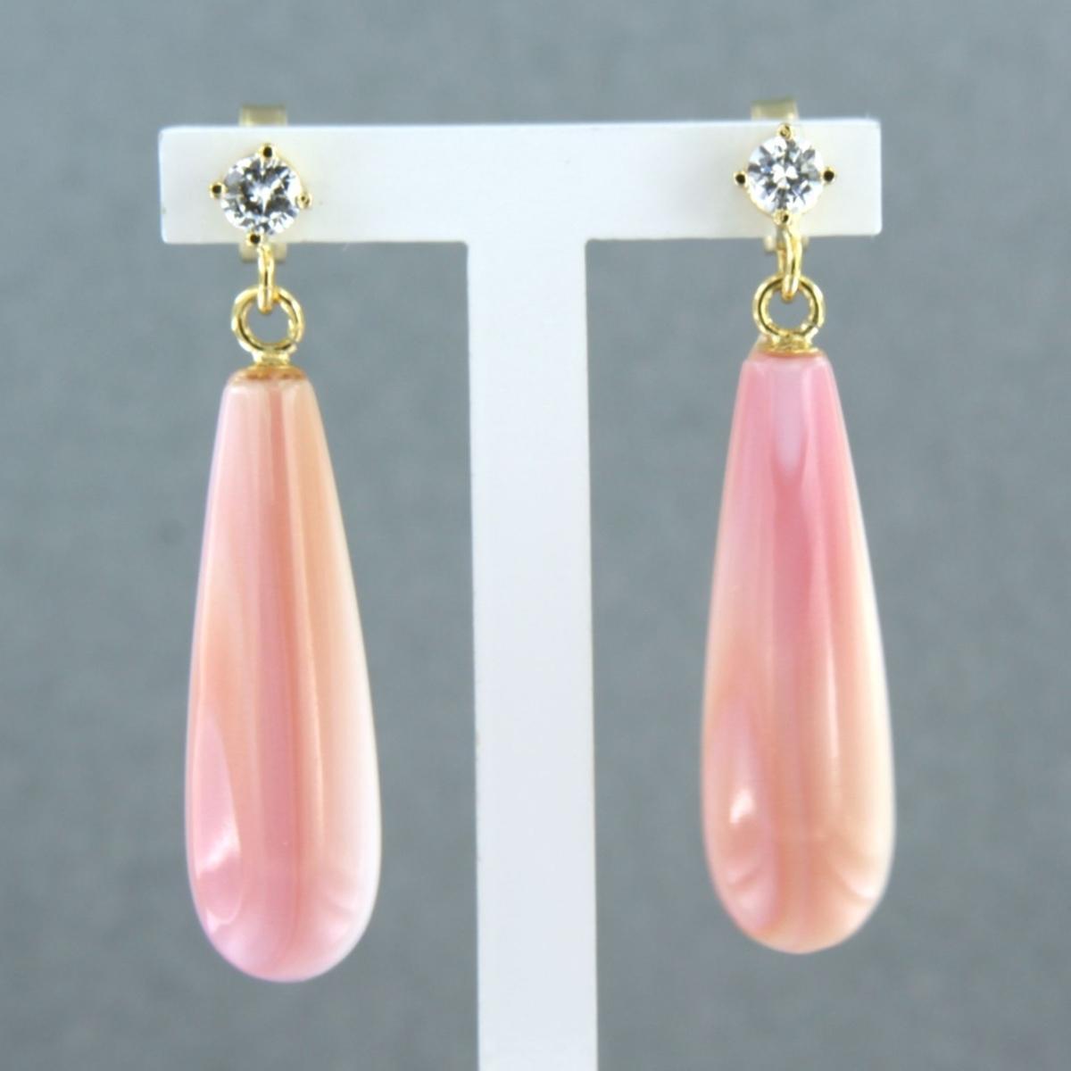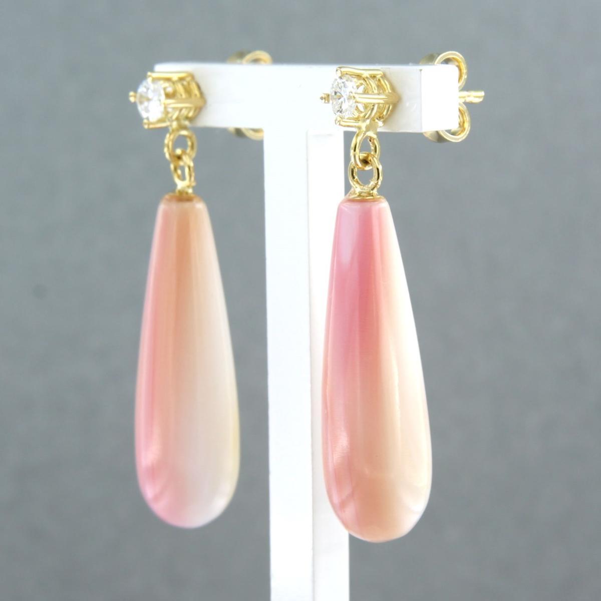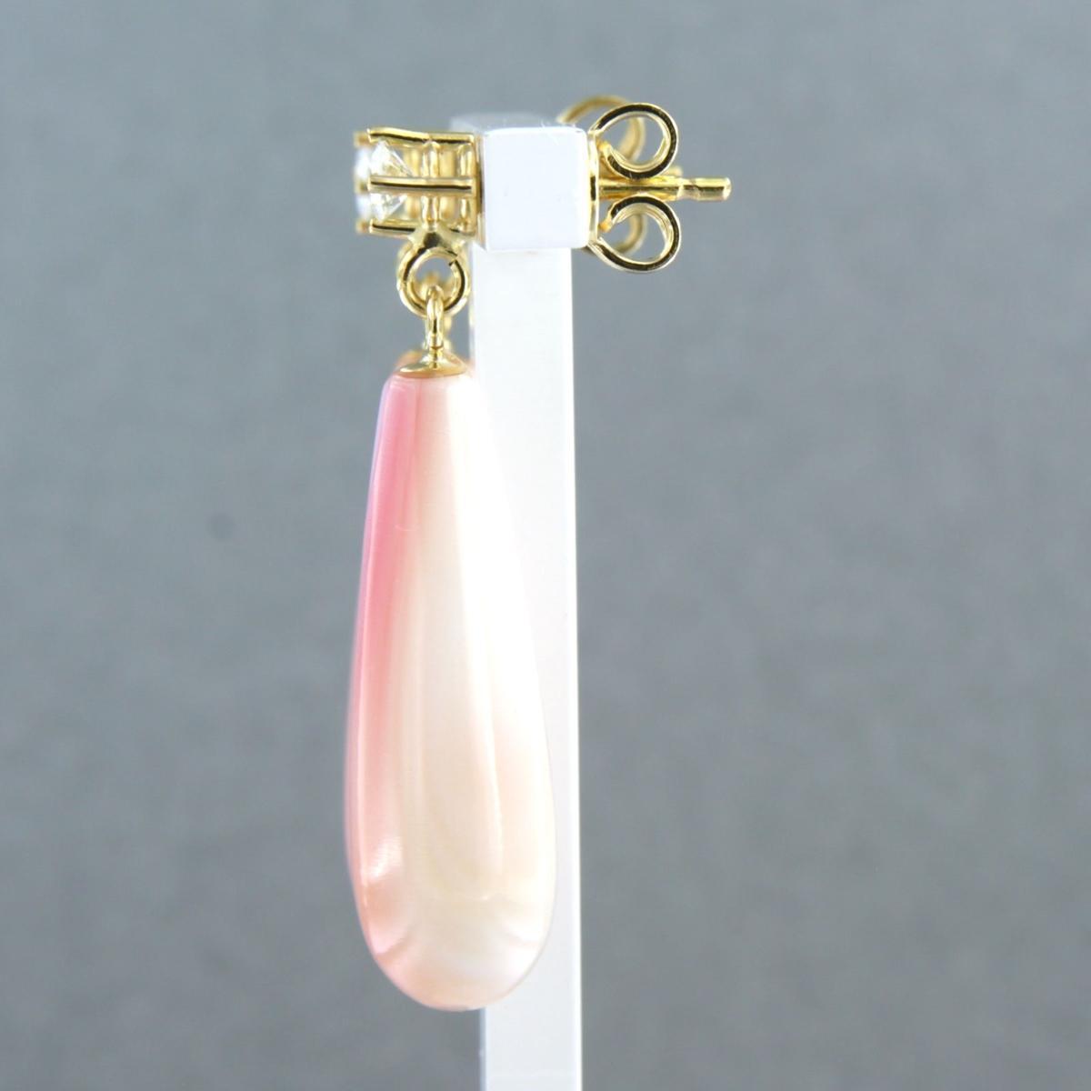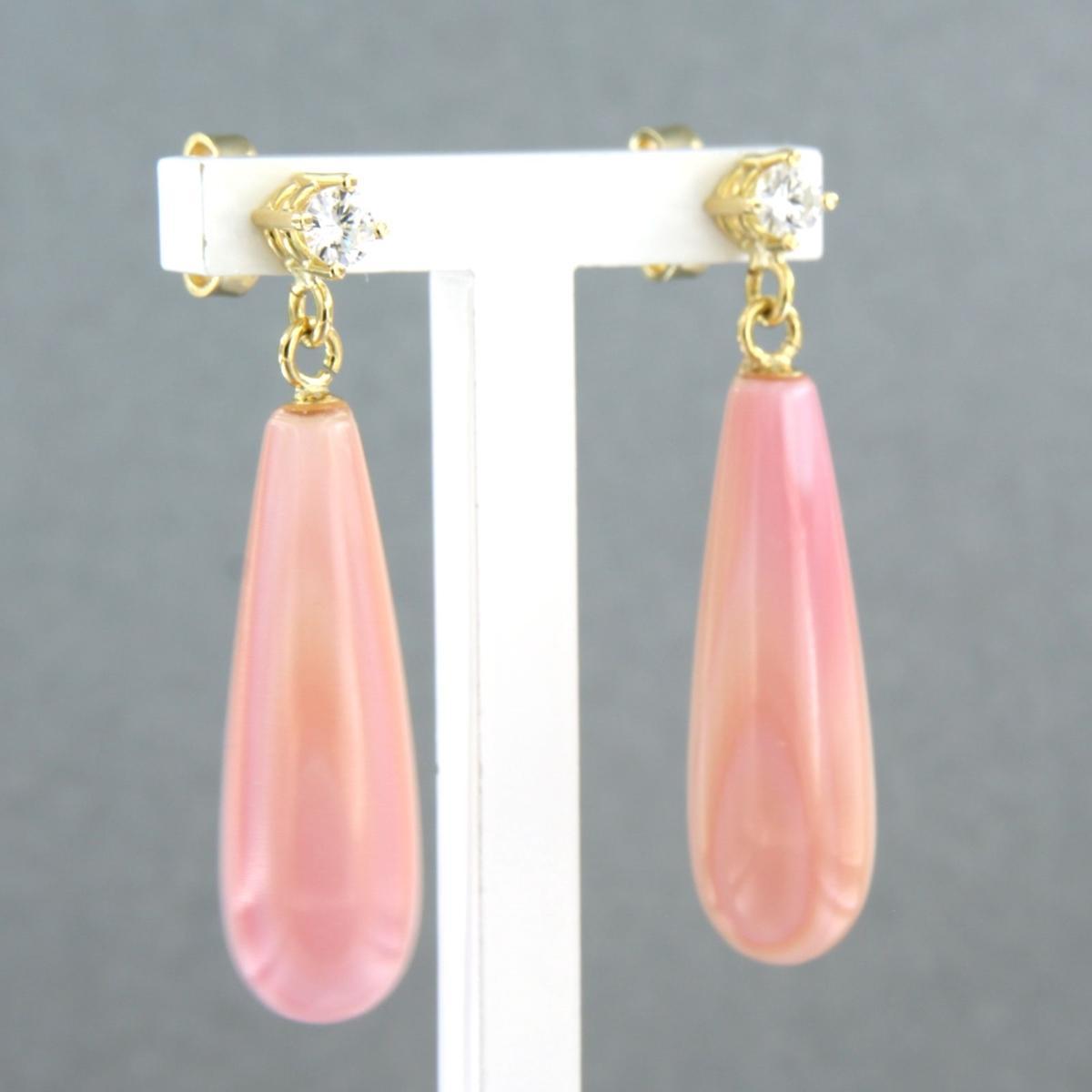 18 Kt. geelgouden oorhangers bezet met roze kwarts en briljant geslepen diamant tot. 0.28 ct.