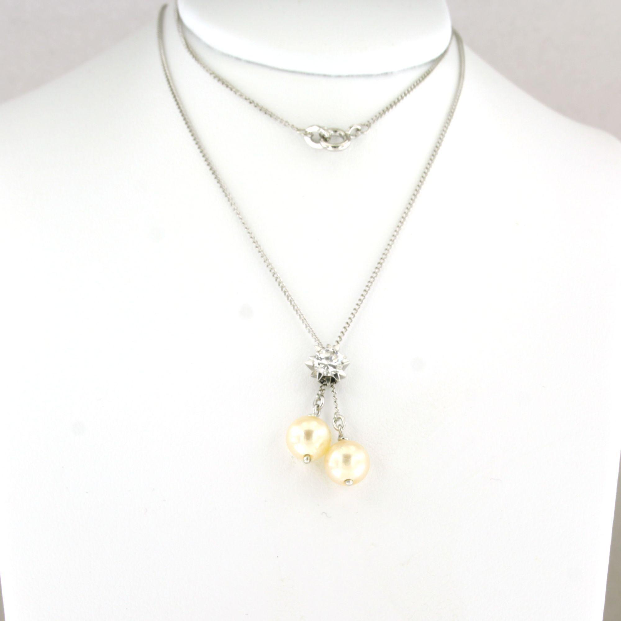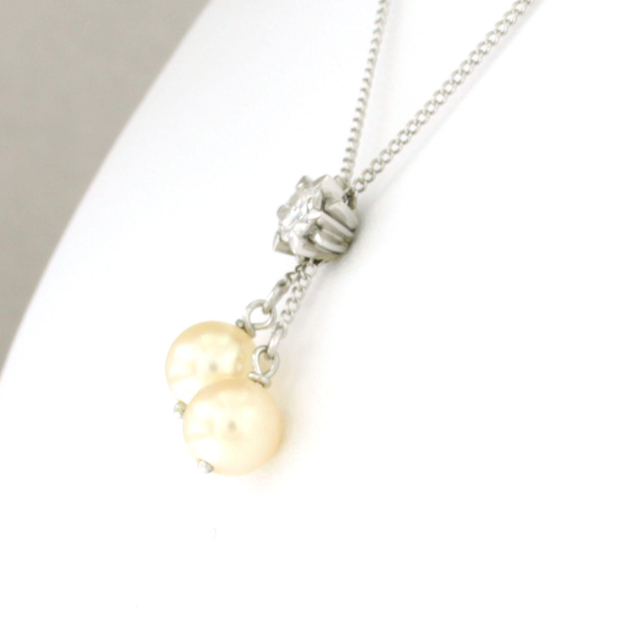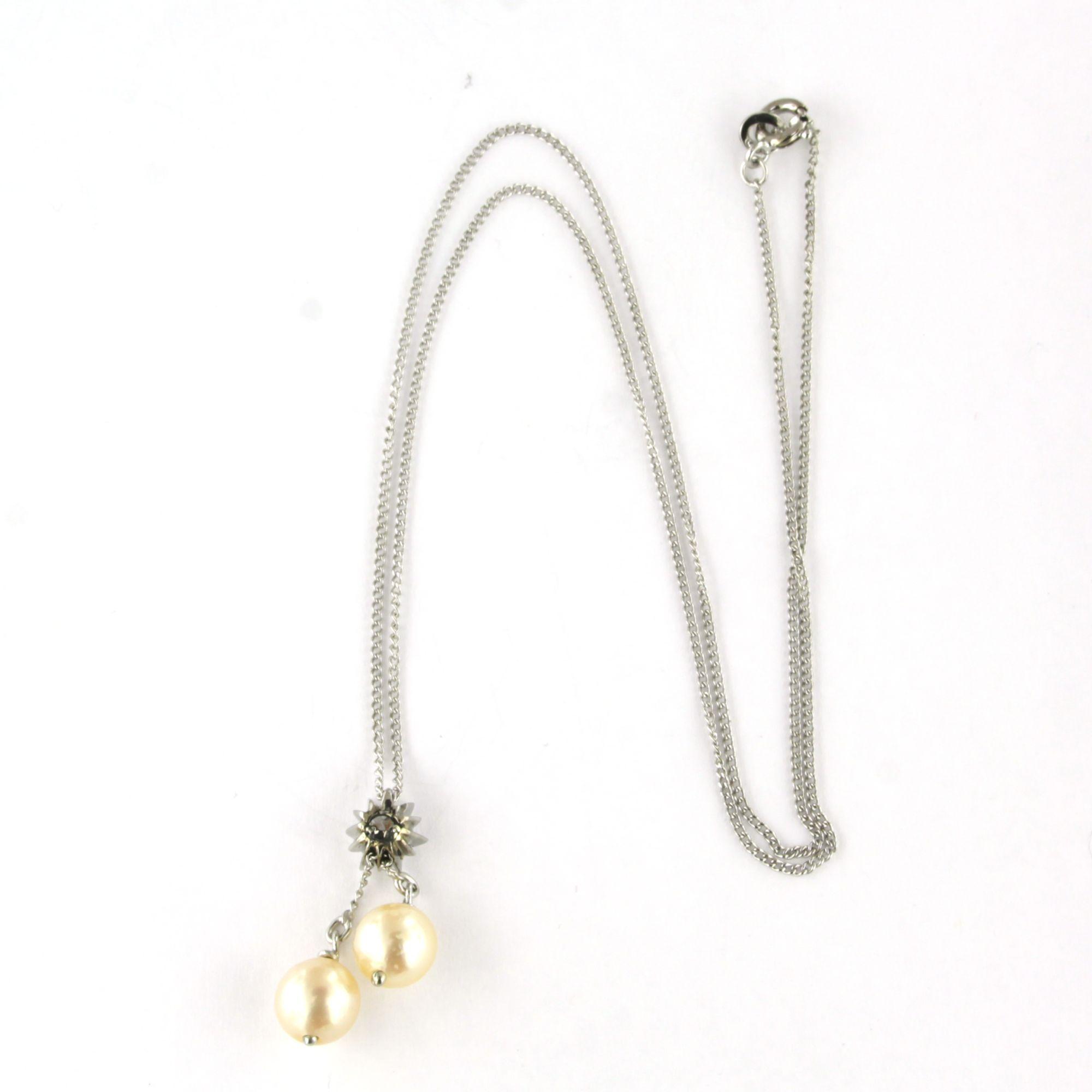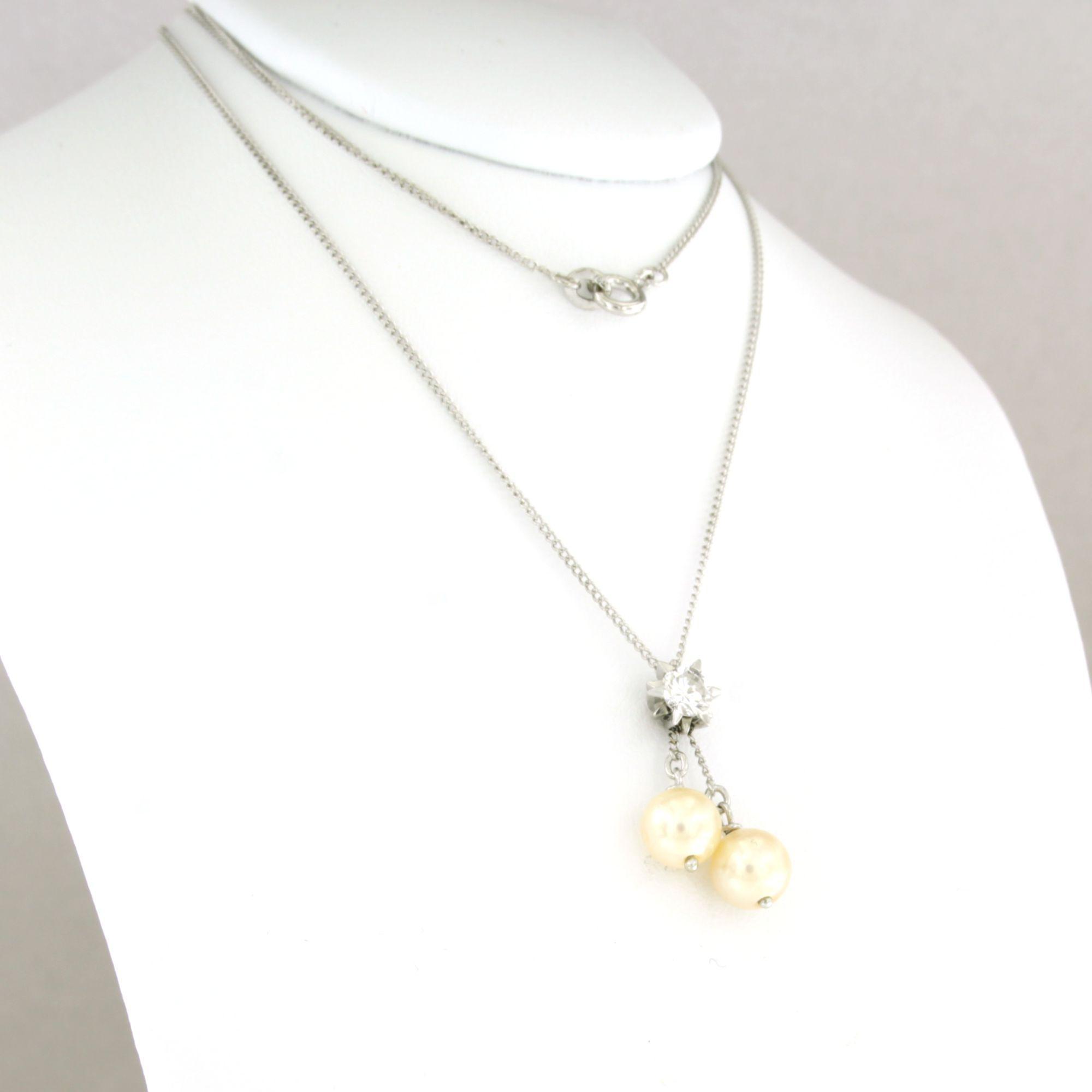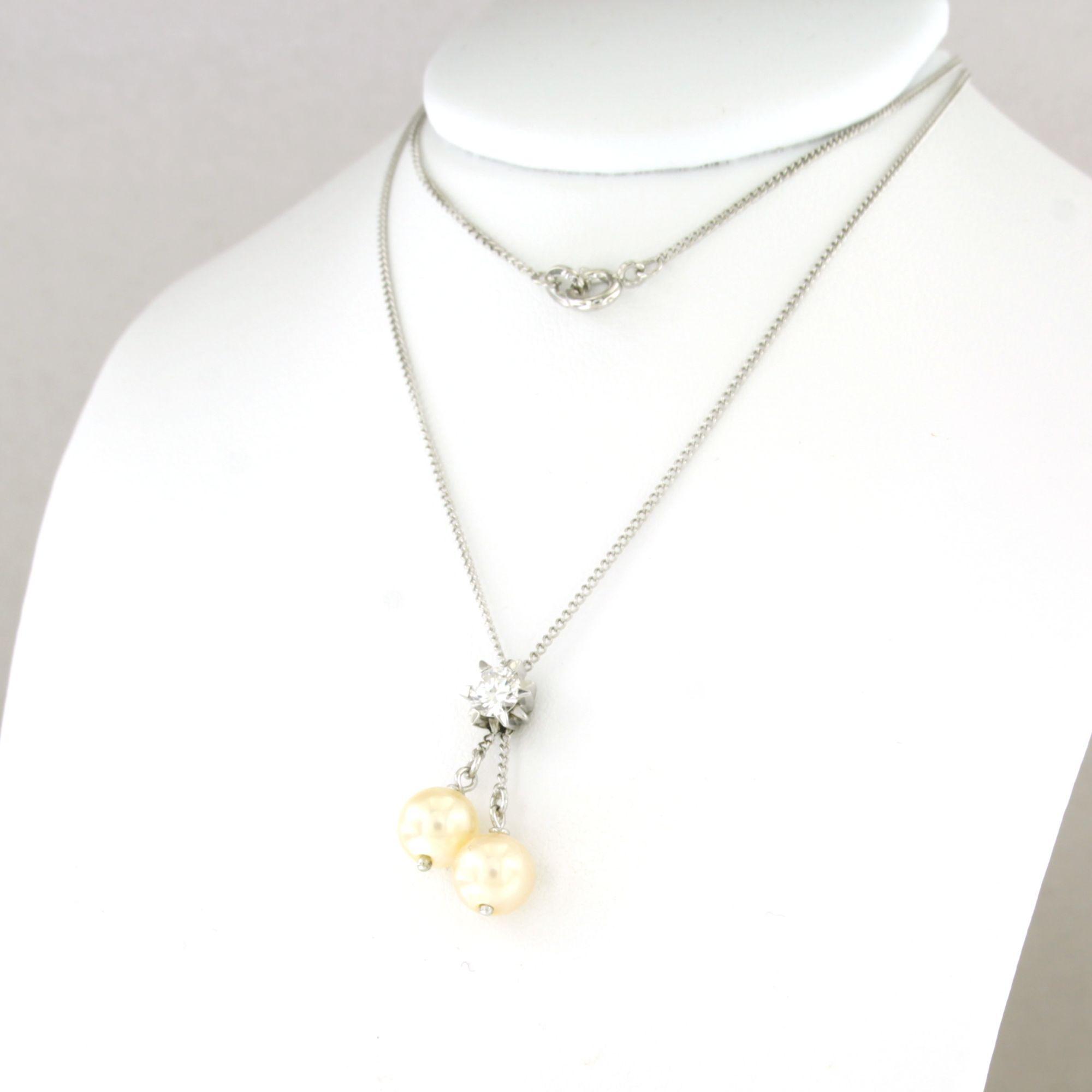 14 Kt. witgouden collier met parels en briljant geslepen diamant tot. 0.15 ct.