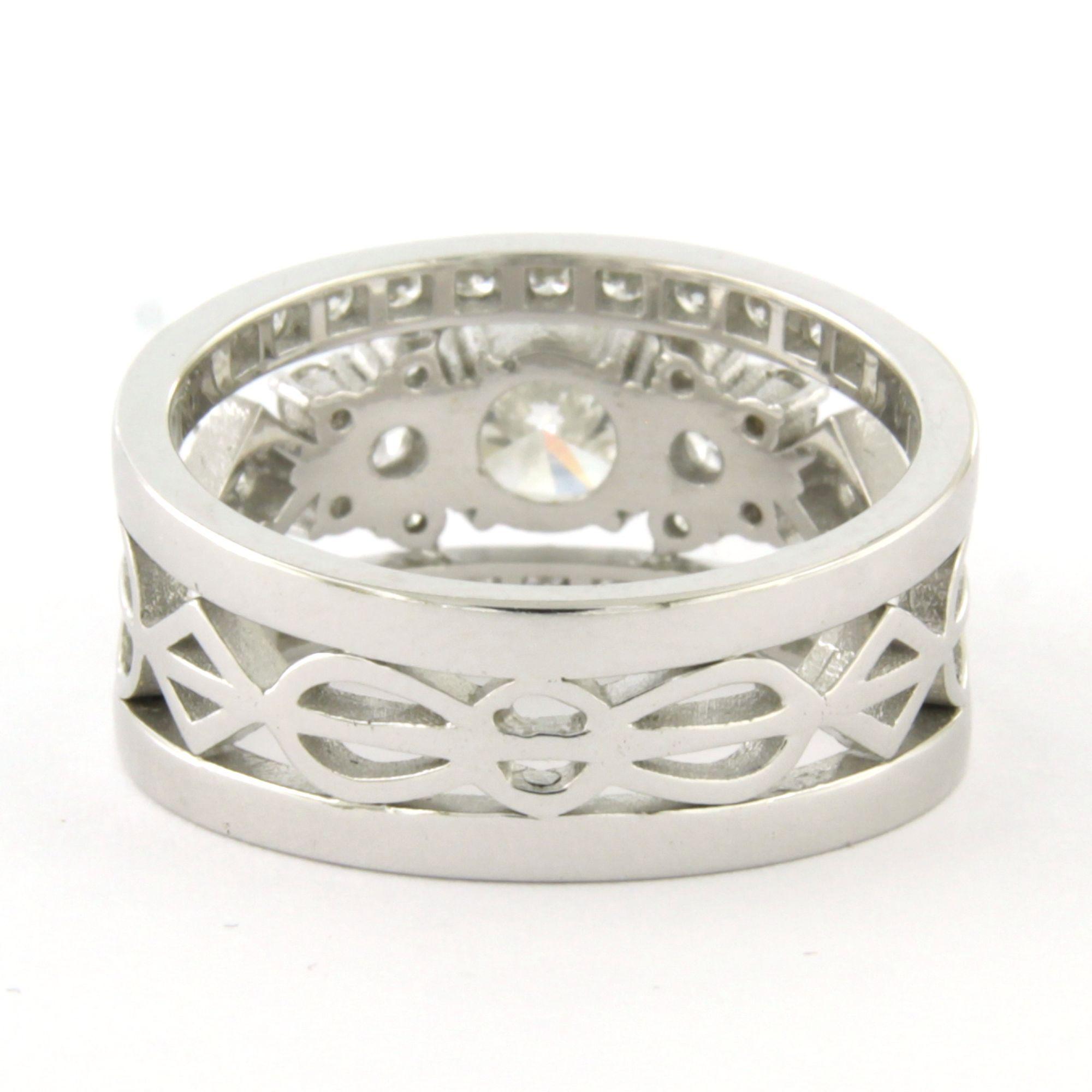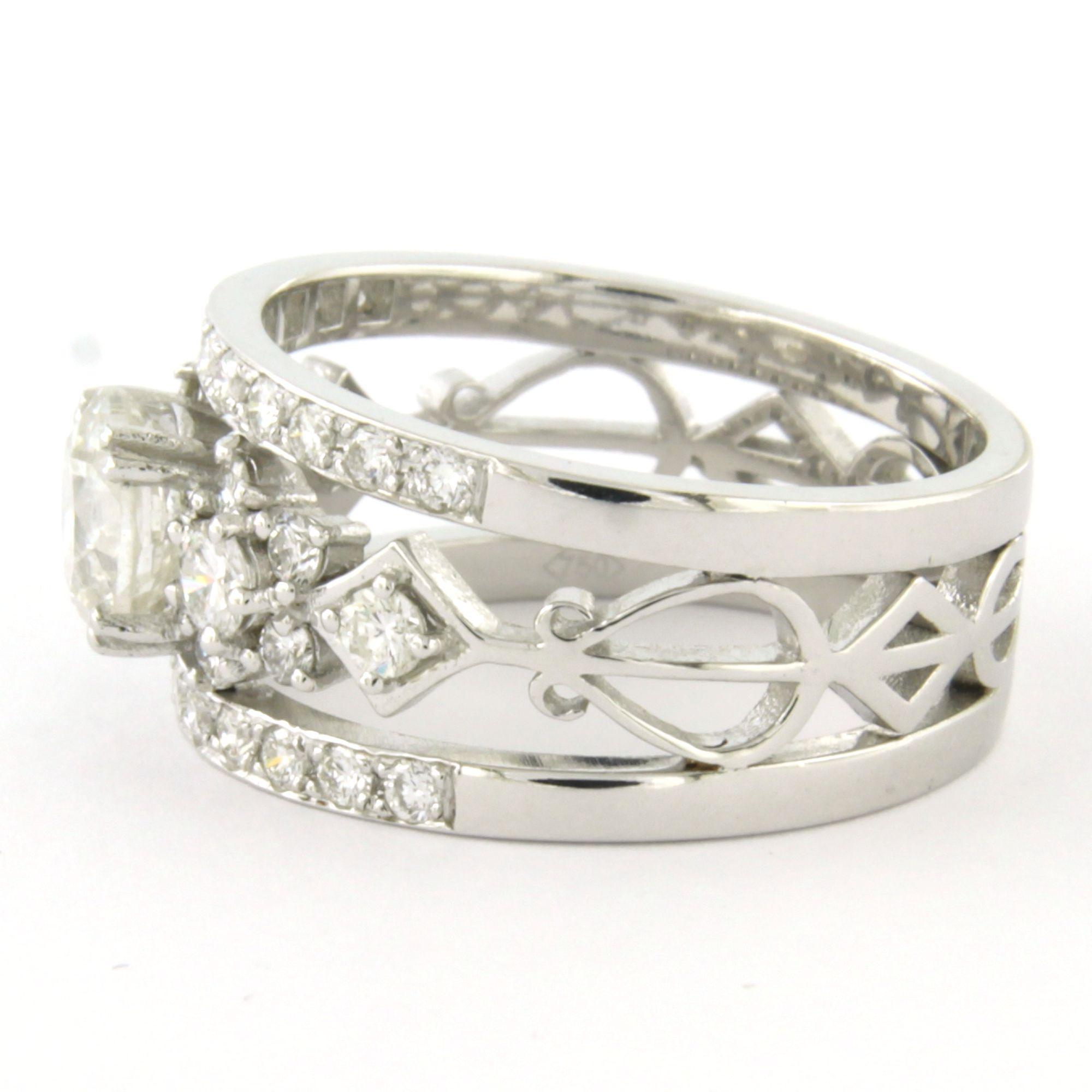 18 Kt. witgouden band ring bezet met centraal een briljant geslepen diamant tot. 1.03 ct. - G - Pique1 volgens IGI diamant certificaat en briljant geslepen diamanten tot. 0.78 ct. - ringmaat 17.5(55)