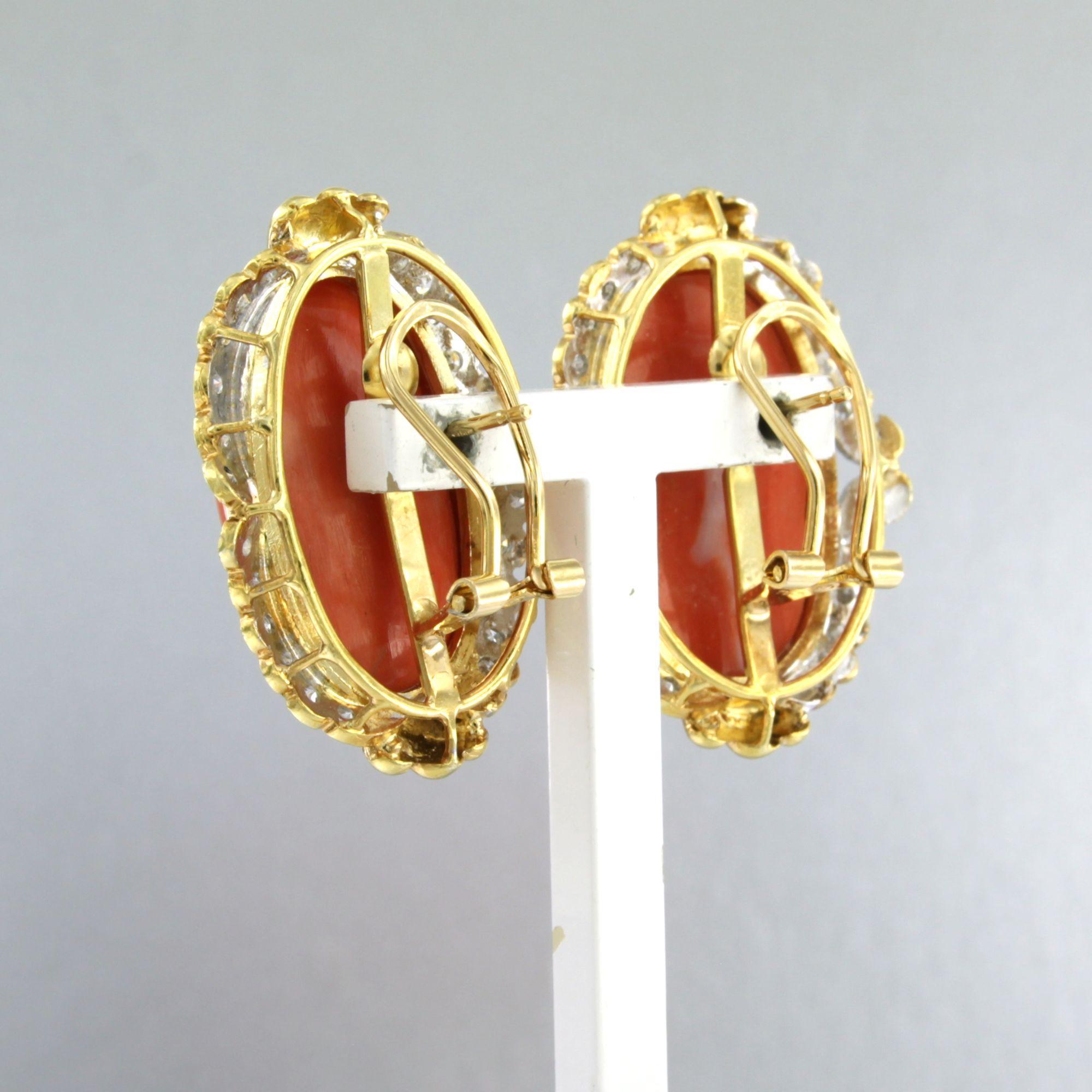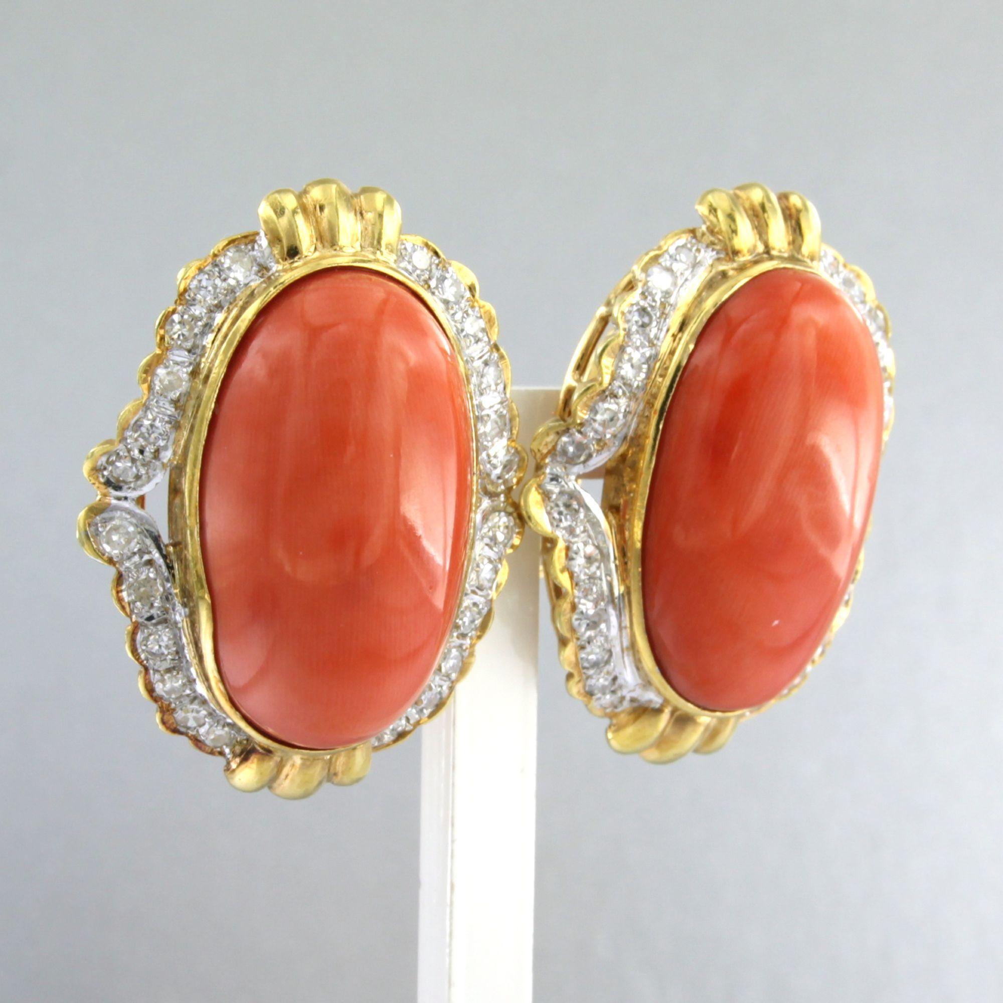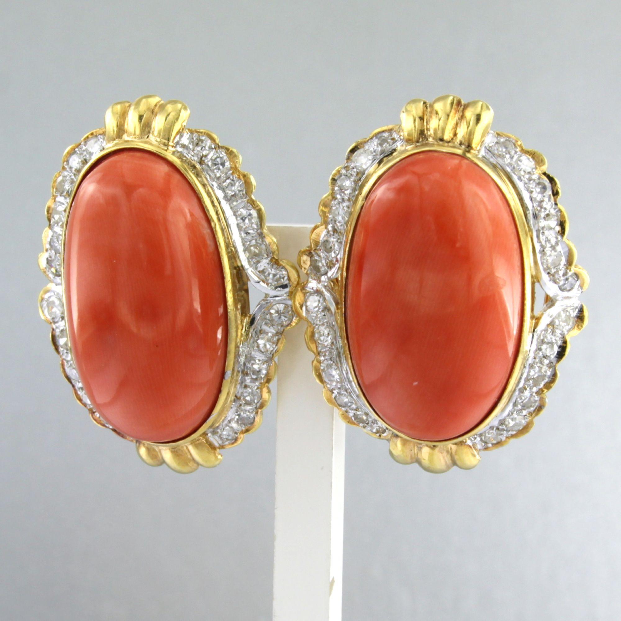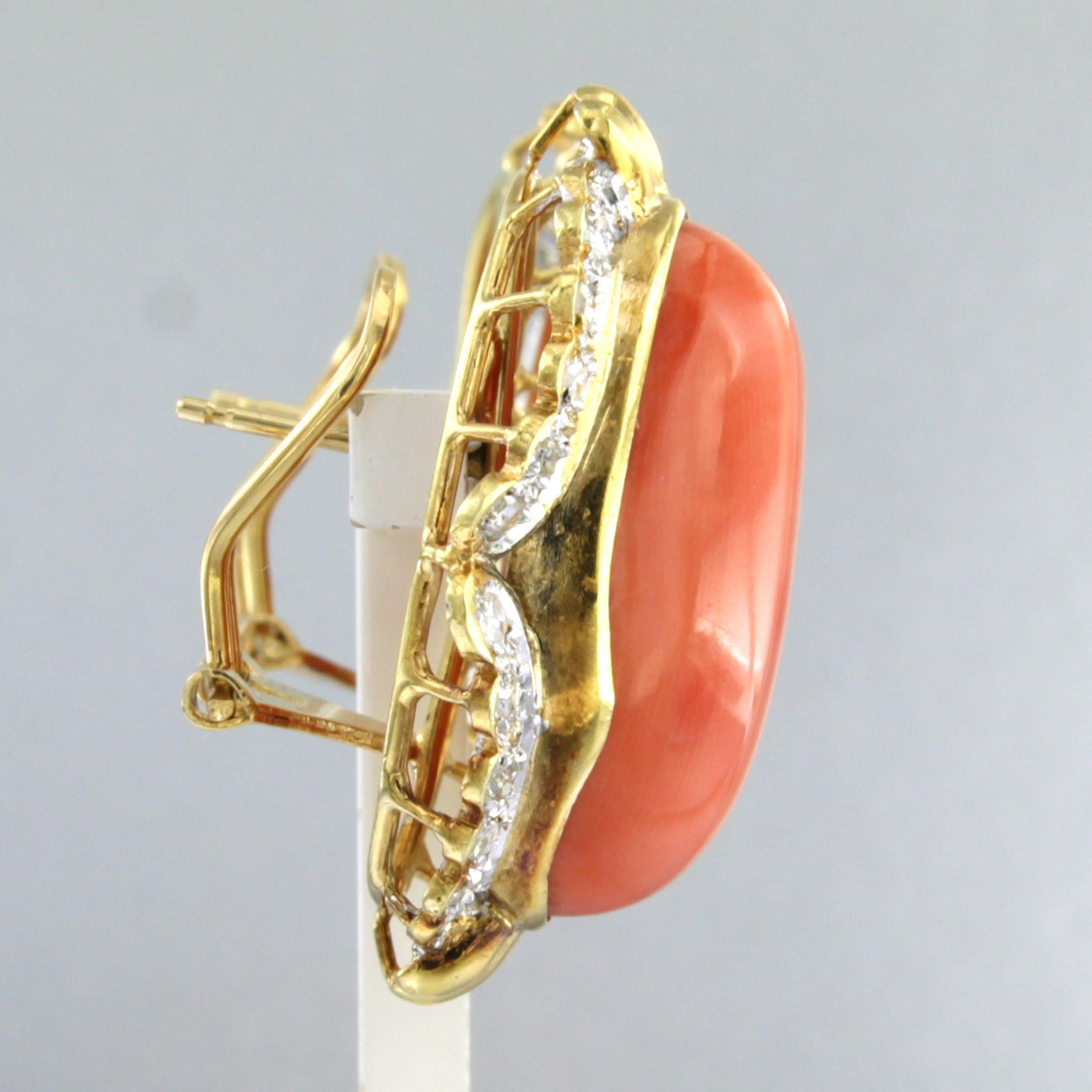 18 Kt. bicolor gouden oorclips bezet met koraal en single cut geslepen diamanten tot. 0.80 ct.