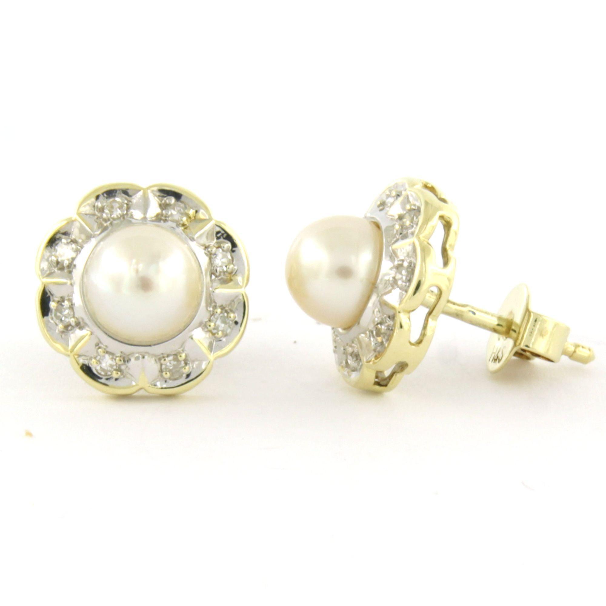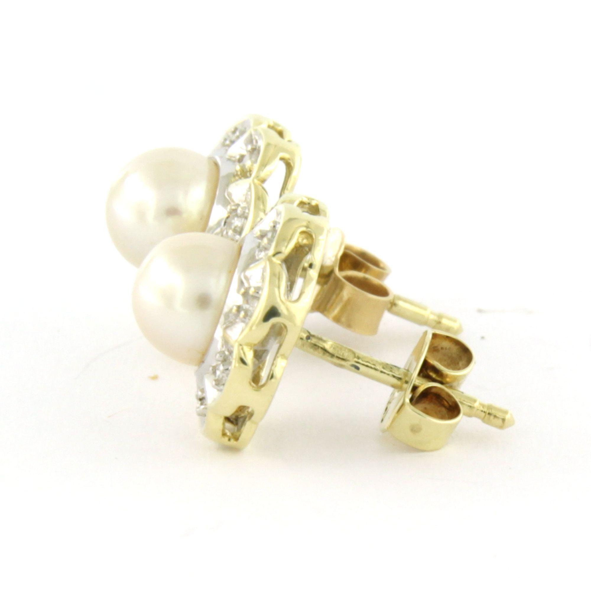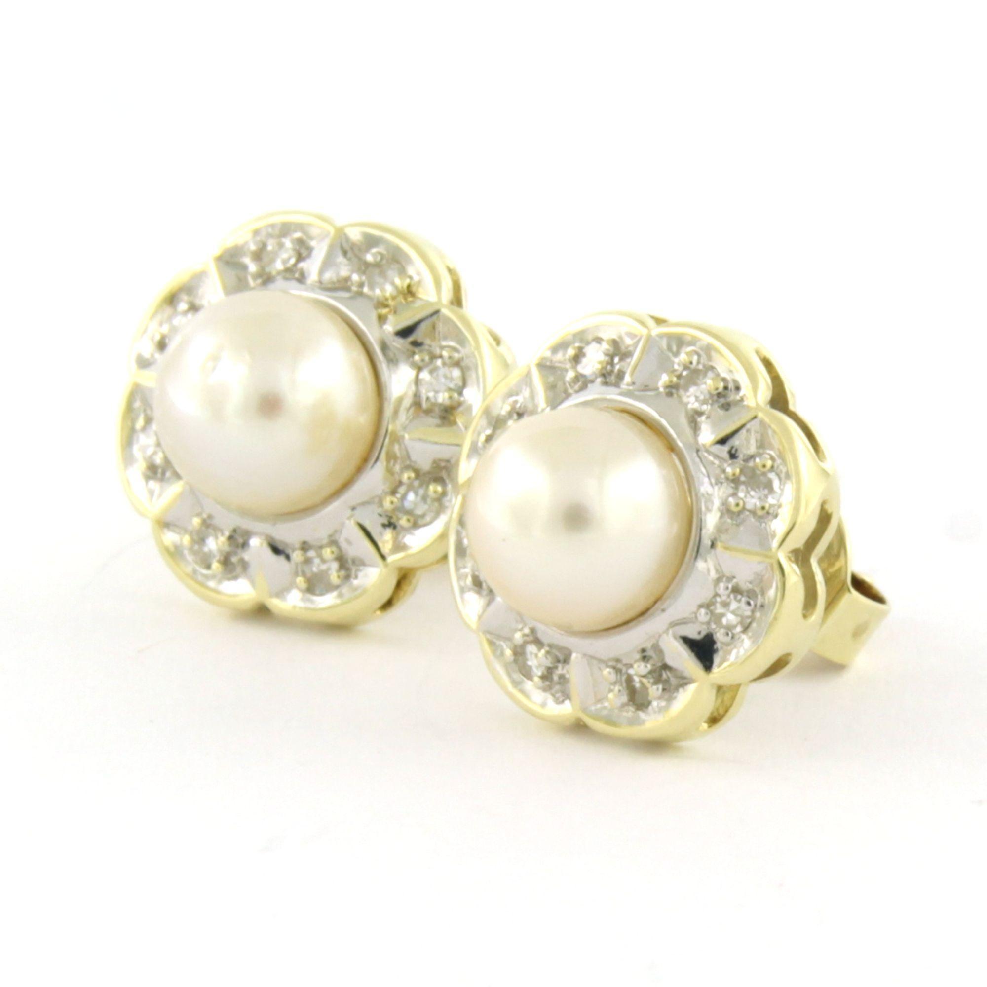 14 Kt. bicolor gouden oorknoppen bezet met parel en single cut geslepen diamanten tot. 0.06 ct.