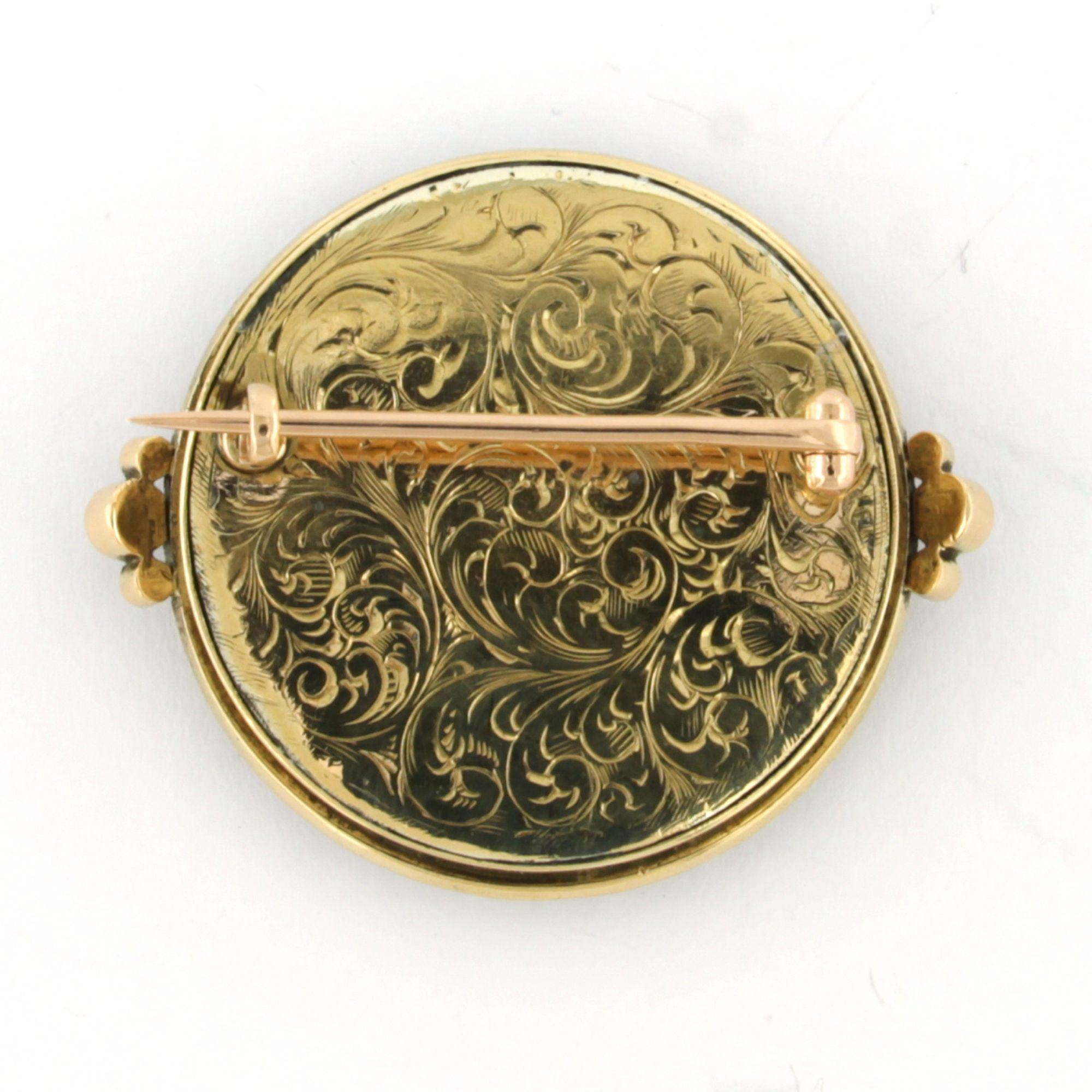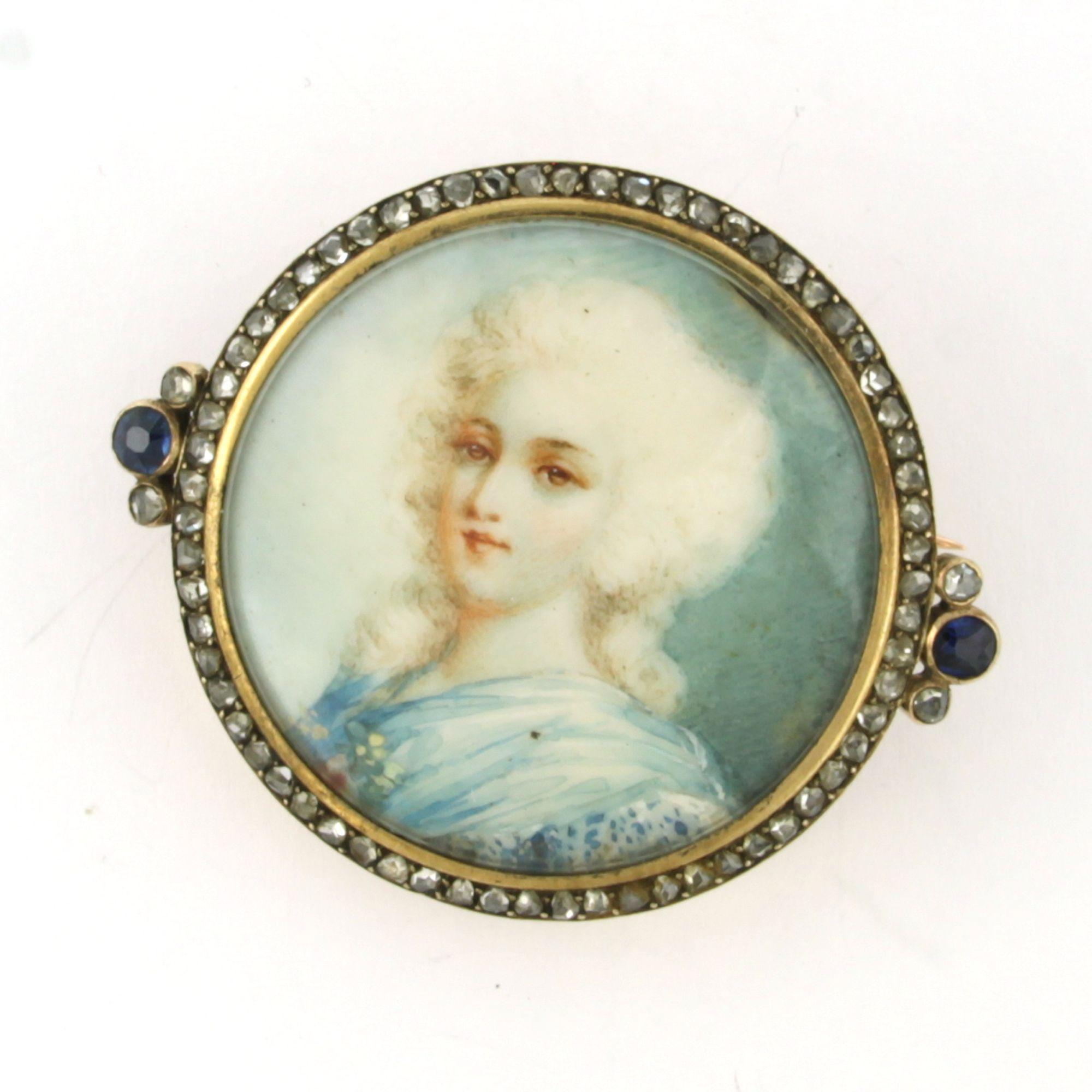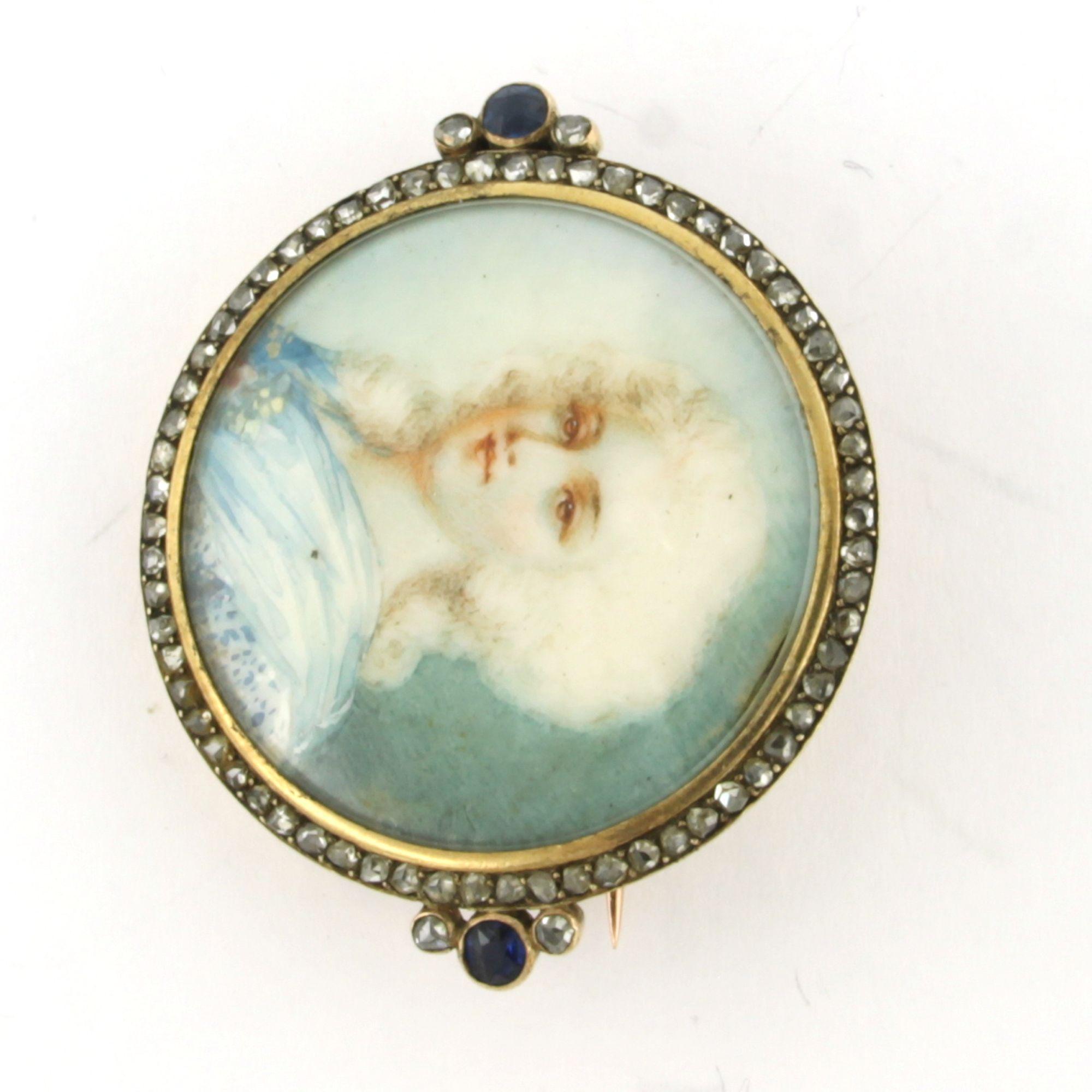 14 Kt. geelgouden broche met een porseleinen afbeelding van een vrouw bezet met roosdiamanten en saffier