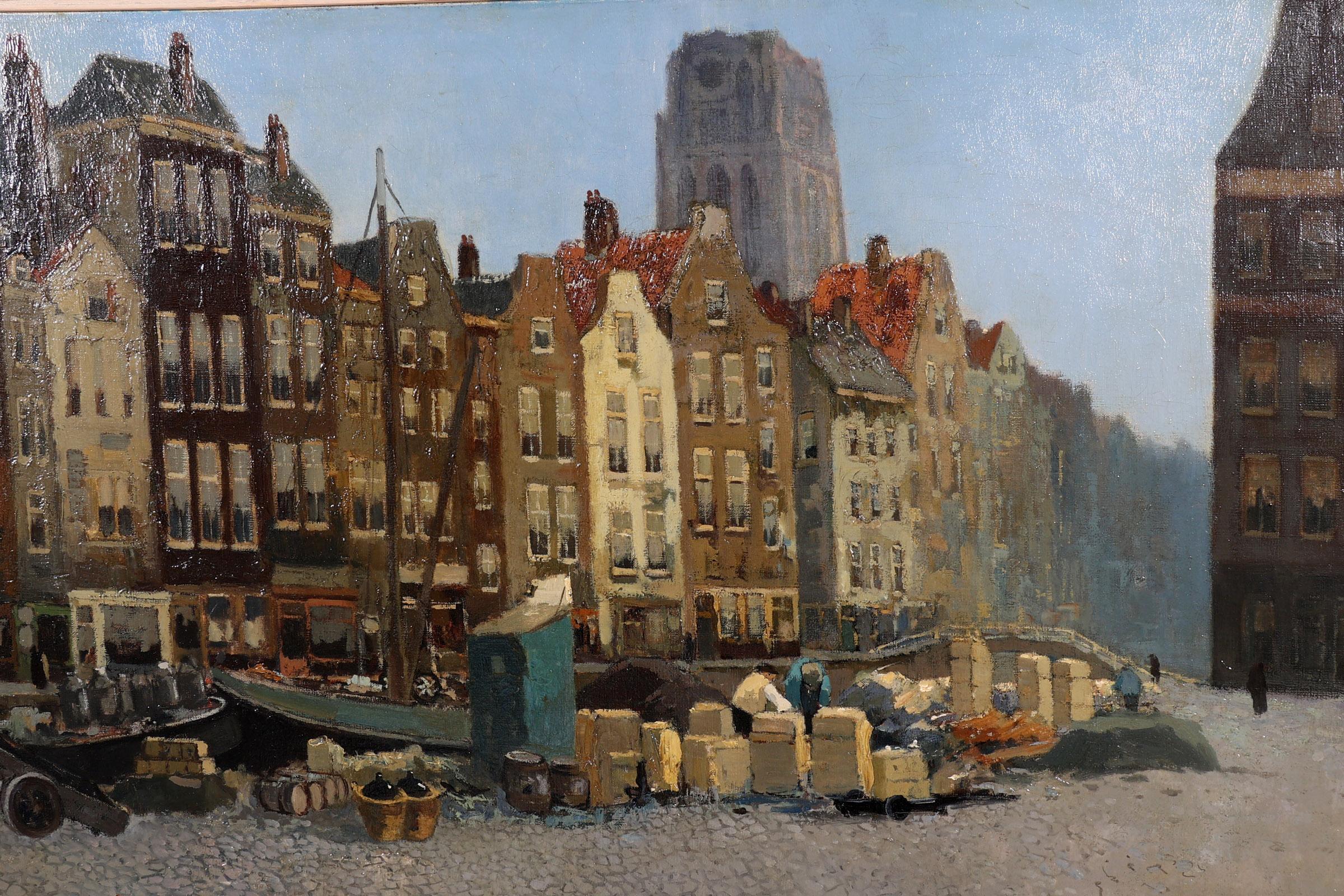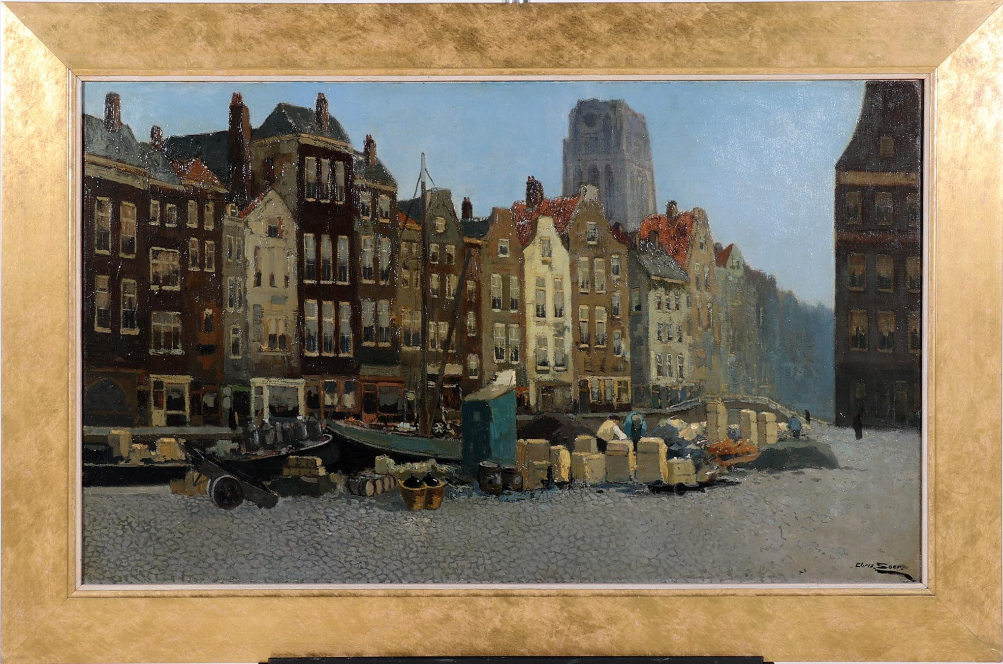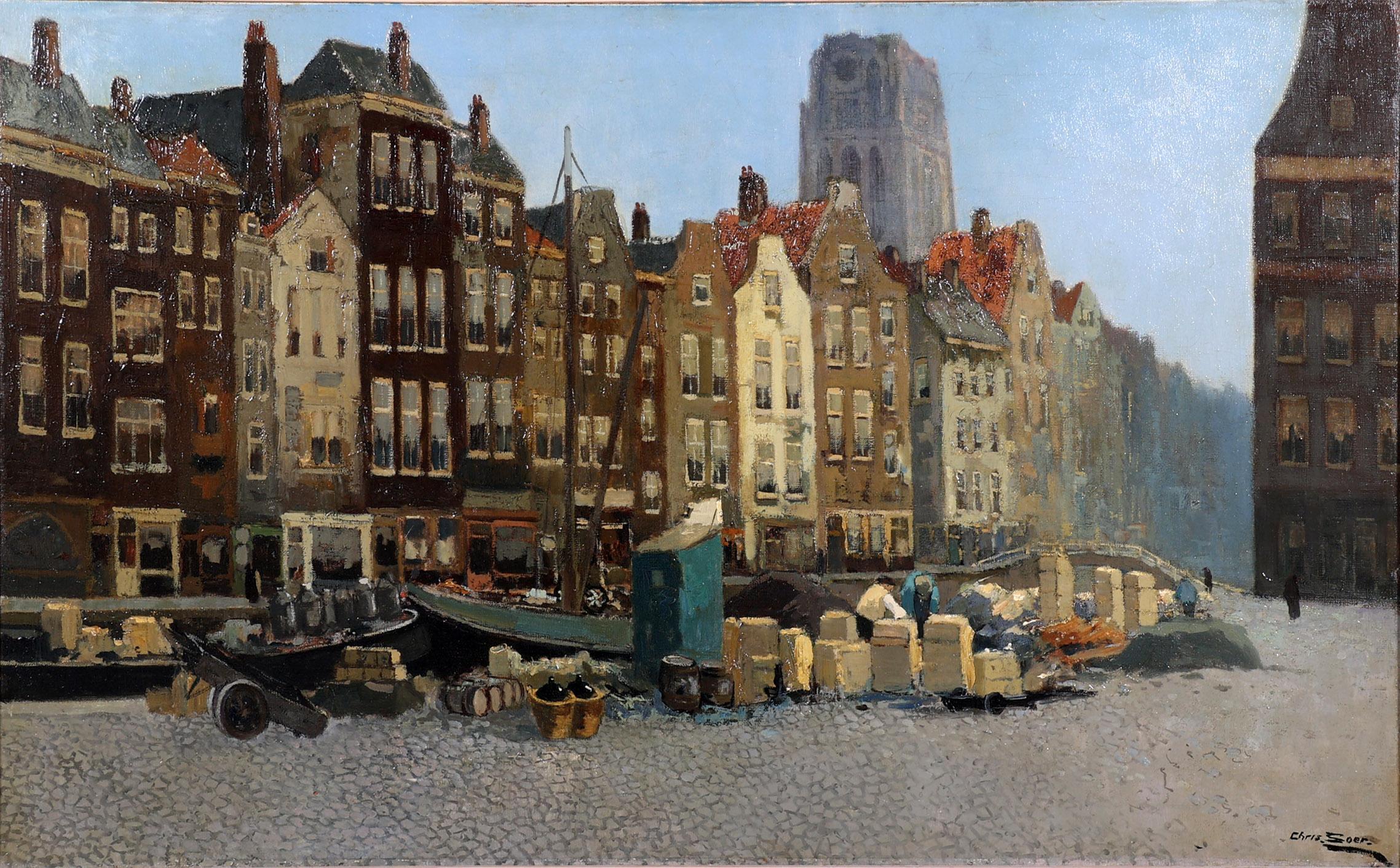 Christiaan (Chris) Soer (1882-1961), Zicht op de Rotterdamse binnenhaven met op de achtergrond Laurenskerk, olieverf op doek, 100 x 60 cm.