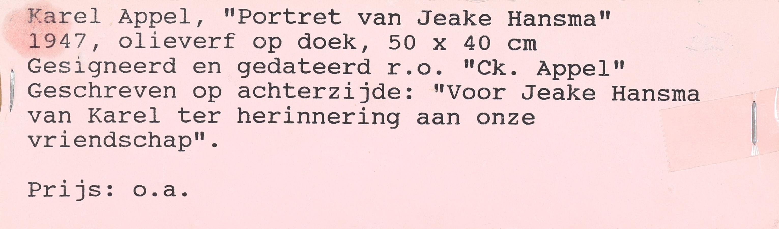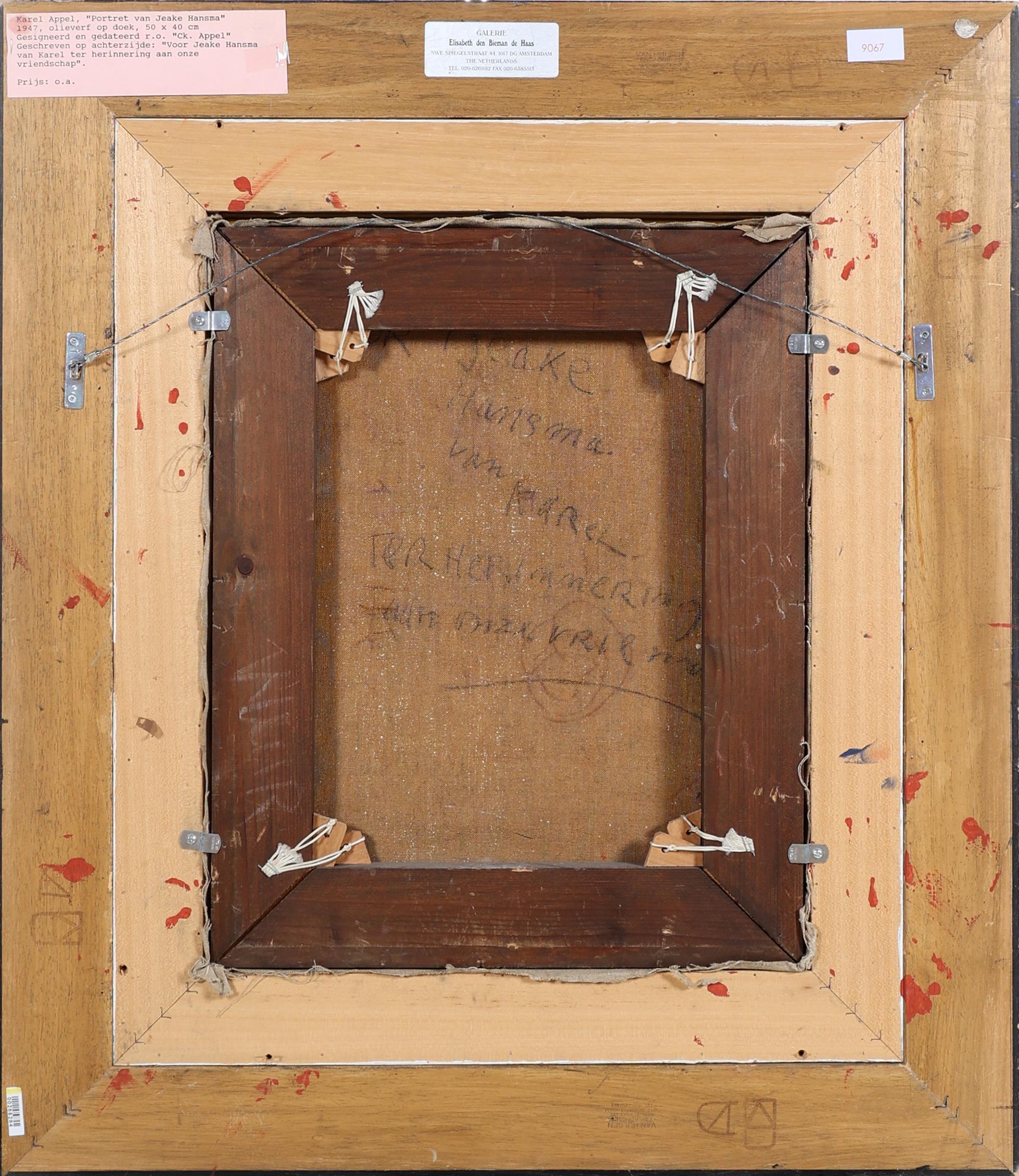 Christiaan 'Karel' Appel (1921-2006), Portret van Jeake Hansma (1947), olieverf op doek, gesigneerd en gedateerd, annotatie verso "voor Jeake Hansma van Karel ter herinnering aan onze vriendschap", 47 x 37 cm. Provenance: Collectie Jeake Hansma, Amsterdam; Amcha Kunstcollectie, 2004; Collectie kunsthandel Elisabeth den Bieman de Haas, Amsterdam. Literatuur: E. den Bieman de Haas, La Femme: Schilderijen & Beelden, Van Spijk, Venlo, 1992, cover & p. 1 (ill.). Tentoonstelling: Kunsthandel Elisabeth den Bieman de Haas, Amsterdam, La Femme: Schilderijen & Beelden, 1992. Nota bene: geregistreerd bij het RKD met nummer 167807